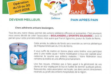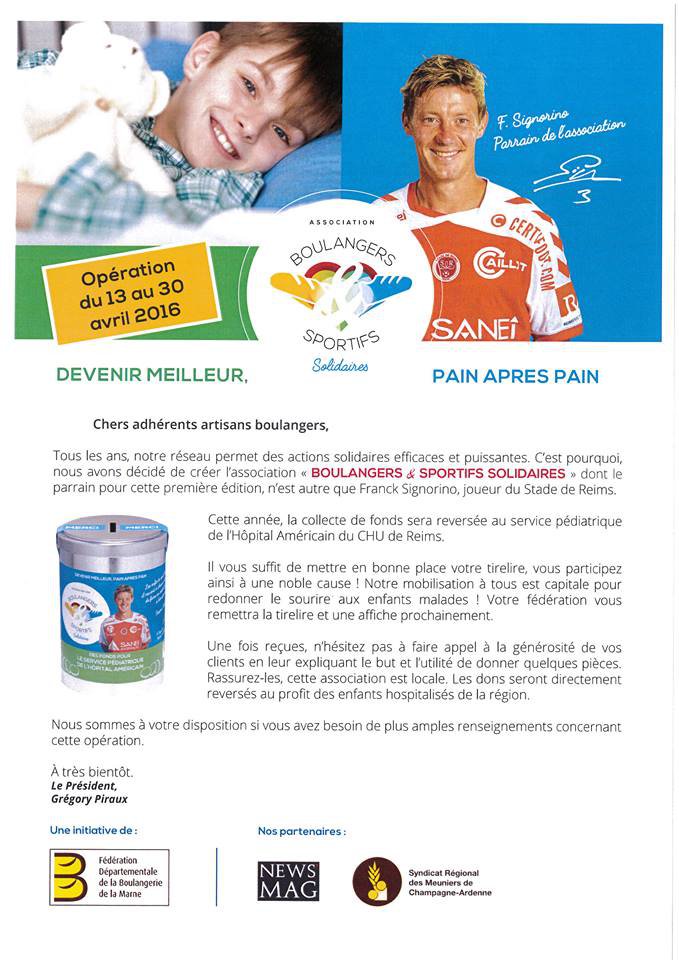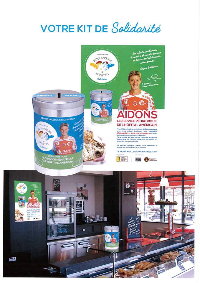 La Fédération de la Boulangerie de la Marne a décidé de créer l’association « BOULANGERS ET SPORTIFS SOLIDAIRES » dont le parrain fondateur, n’est autre que Franck SIGNORINO, joueur Pro au Stade de Reims.