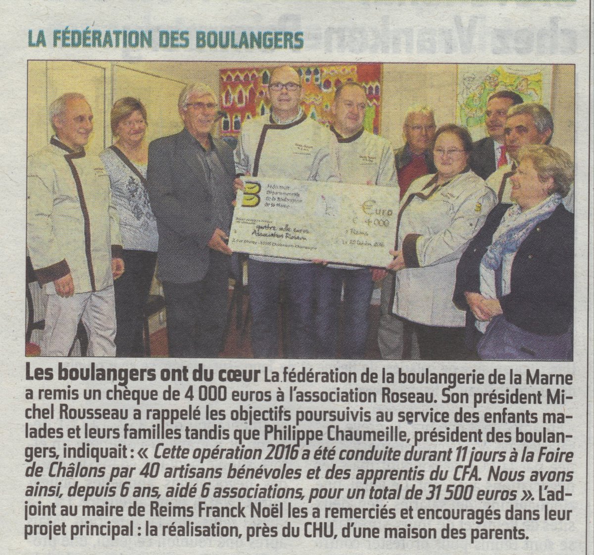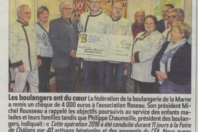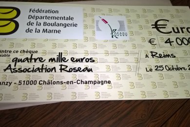 Depuis plusieurs années, la Fédération de la Boulangerie de la Marne participe à la Foire de Chalons en Champagne pour mettre en avant son savoir faire et vendre les produits fabriqués sur le stand au profit d'une association. Cette année, la boulangerie artisanale a travaillé au profit de l’association « ROSEAU » qui aide les enfants atteints d'une leucémie ou d'un autre cancer. Le mardi 25 octobre dernier, la Fédération de la Boulangerie a remis un chèque de 4.000 euros aux dirigeants de cette association afin de concrétiser leur projet principal : la réalisation, près du CHU, d’une maison des parents.