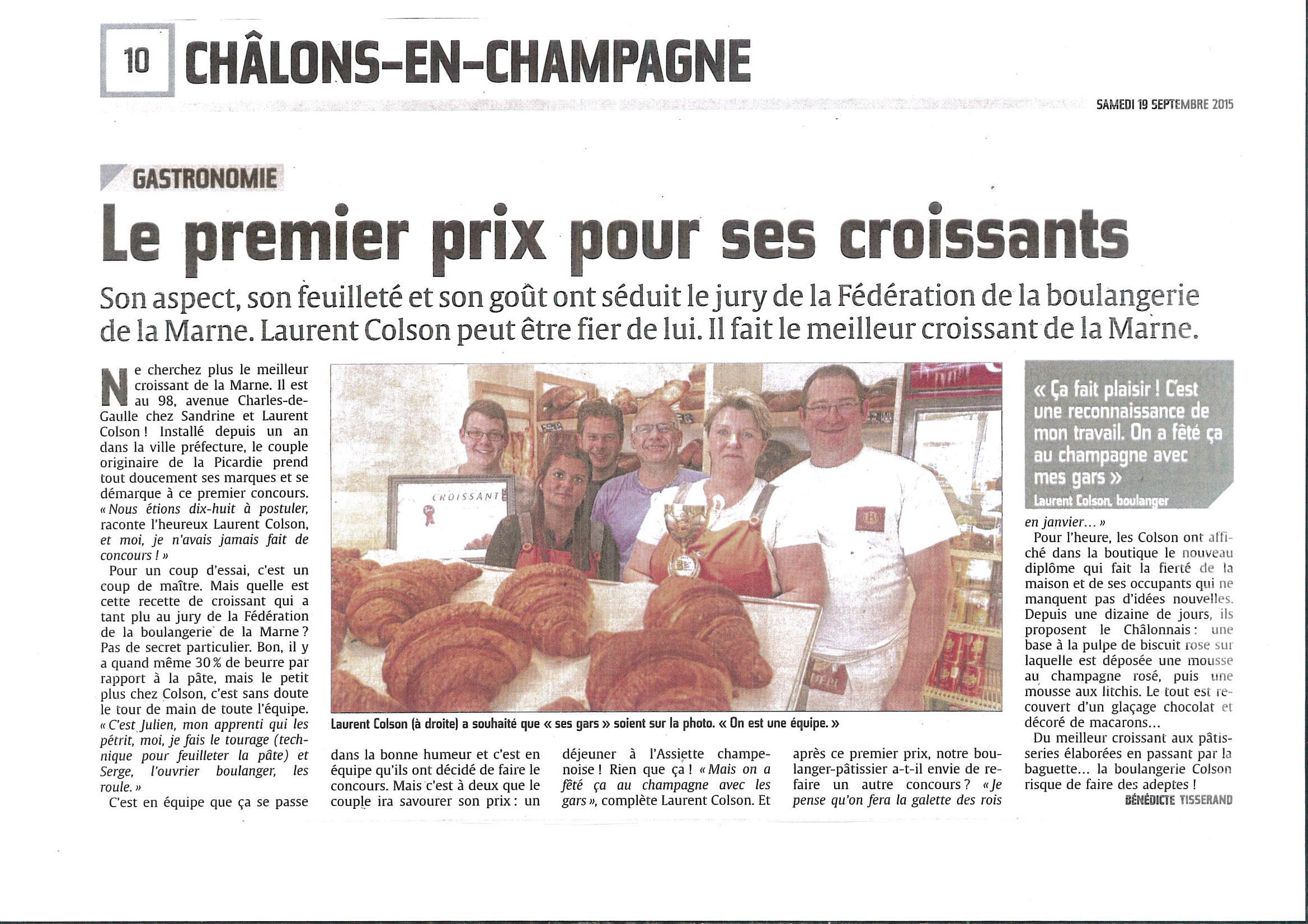 - 1er : Laurent COLSON, boulanger à Chalons en Champagne, a reçu un bon cadeau pour un diner au Restaurant l’Assiette Champenoise à Tinqueux pour 2 personnes d’une valeur de 300 €.