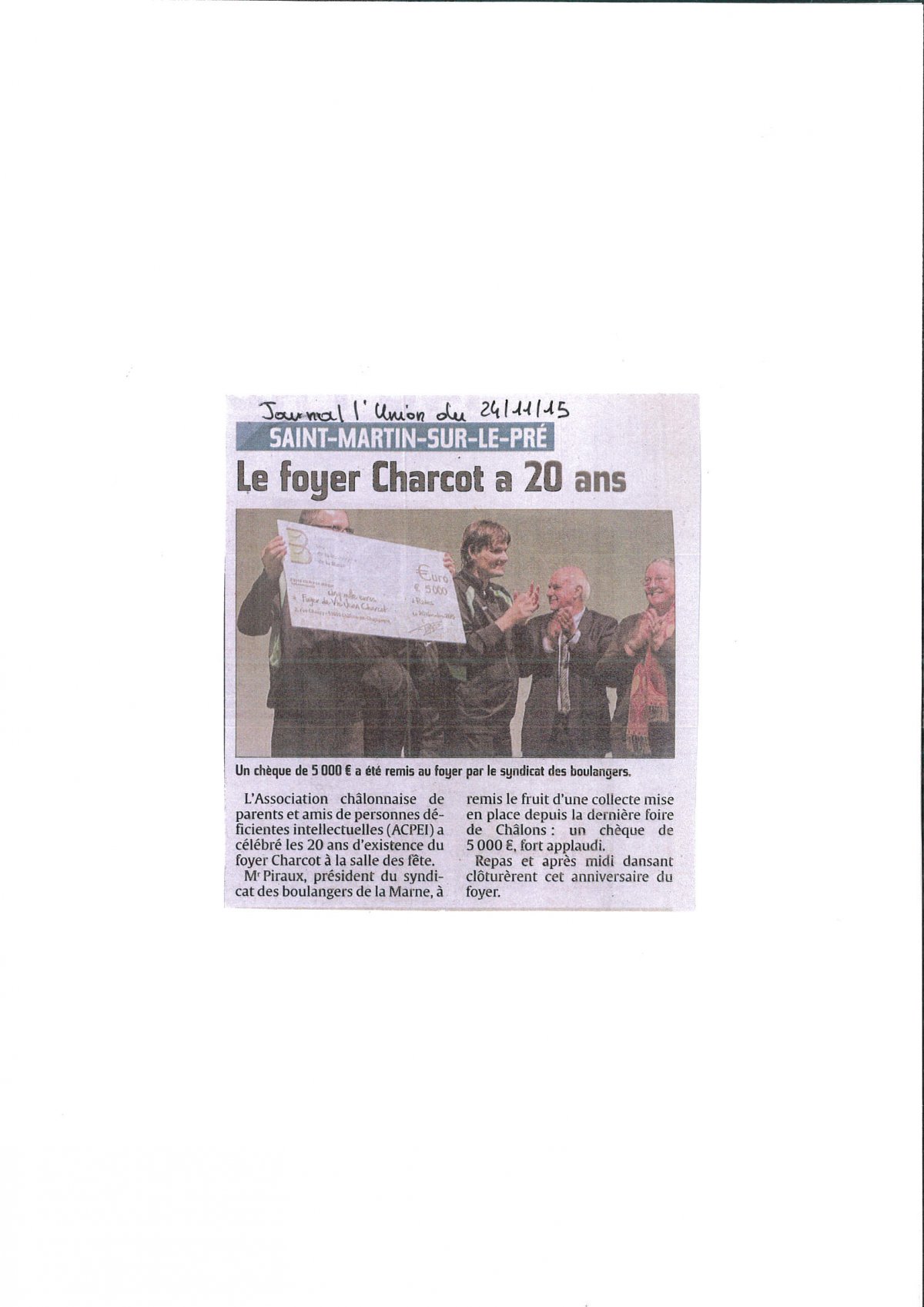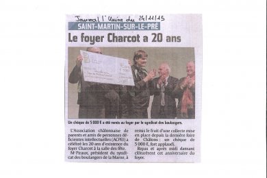 Remise du chèque de 5000 € le vendredi 20 novembre 2015 à l'Association "Foyer de vie Jean Charcot" de Châlons en Champagne. Le Président PIRAUX a tenu à remercier les fournisseurs de matières premières, la Meunerie Régionale, les sponsors, les boulangers actifs et retraités ayant participé à l'animation du stand durant ces 11 jours de la foire de Châlons, qui ont permis de vendre les produits fabriqués sur place et de remettre les bénéfices de ces ventes comme chaque année désormais à une association. Ce qui porte notre compteur à 27.700 € en 5 ans!!!